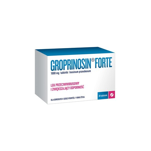 Tabletki Groprinosin Forte to lek przeciwwirusowy, a także pobudzający układ odpornościowy. Substancją czynną leku jaką jest pranobeks inozyny hamujący w warunkach in vitro namnażanie chorobotwórczych wirusów z grupy Herpes. Groprinosin Forte stosuje się przy obniżonej odporności, gdy występują nawracające infekcje górnych dróg oddechowych, jak również u osób ze zdiagnozowanym wirusem opryszczki pospolitej podczas wystąpienia jej na wargach lub skórze. Produkt leczniczy jest przeznaczony dla osób powyżej 1-ego roku życia.