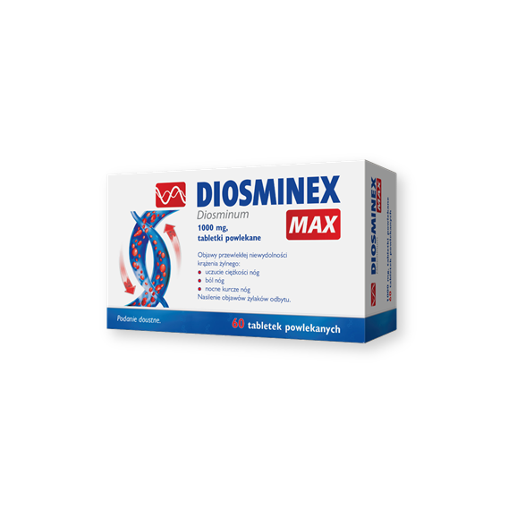 Diosminex Max to produkt leczniczy zawierający diosminę, która wykazuje działanie ochronne na naczynia krwionośne i może być stosowana w uczuciu "ciężkich nóg" i wspomagająco w leczeniu hemoroidów.