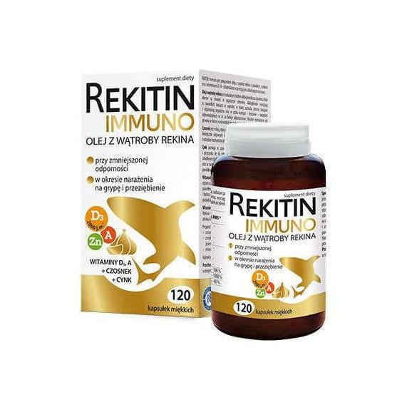 Rekitin Immuno to suplement diety zawierający olej z wątroby rekina z czosnkiem, cynkiem oraz witaminami D i A - składnikami wspierającymi układ odpornościowy.