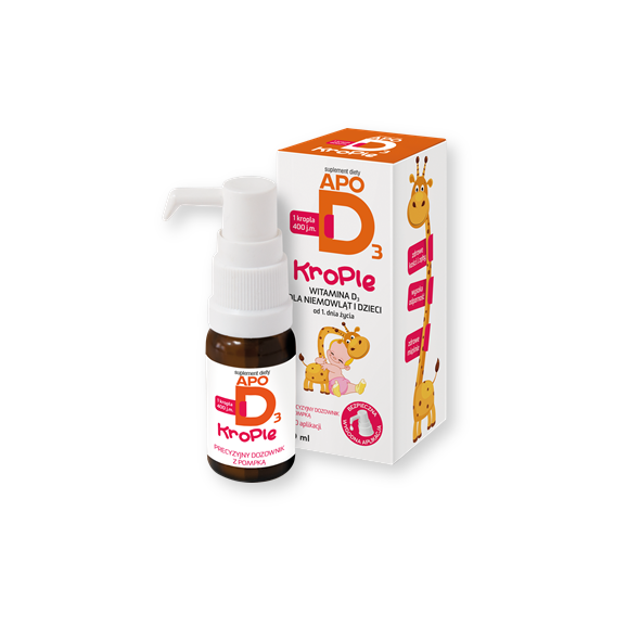 ApoD3 - suplement diety w postaci kropli (dozownik z pompką), zawierający witaminę D3. Produkt przeznaczony dla dzieci od 1. roku życia, dla noworodków i niemowląt od 1. dnia życia.