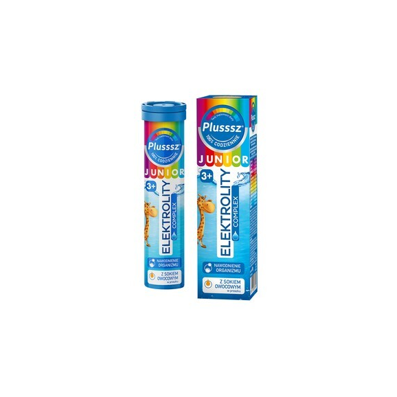Plusssz Junior Elektrolity Complex - suplement diety zawierający kompleks najważniejszych elektrolitów oraz kompleks witamin. Produkt przeznaczony dla dzieci powyżej 3 roku życia i osób dorosłych.