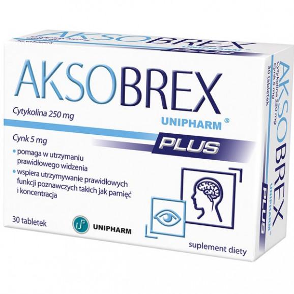 Aksobrex Unipharm Plus to suplement diety będący połączniem dwóch substancji aktywnych: cytykoliny w postaci soli wewnętrznej oraz cynku w formie glukonianu. Cytykolina jest organicznym związkiem chemicznym, w skład którego wchodzi m.in. cytydyna i cholina. Po dostaniu się do organizmu uwalnia cholinę, będącą prekursorem acetylocholiny. Dodatkowo pełni również rolę prekursora fosfatydylocholiny, będącej głównym budulcem błon komórkowych. Cynk jest składnikiem mineralnym, który pełni rolę w prawidłowym funkcjonowaniu organizmu człowieka.
