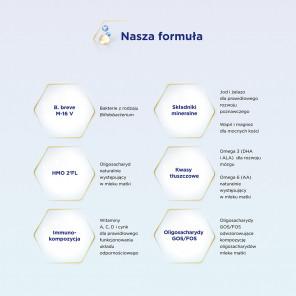 Składniki: laktoza z mleka, odtłuszczone mleko w proszku, odmineralizowana serwatka w proszku z mleka, wysokooleinowy olej słonecznikowy, galaktooligosacharydy GOS z mleka (8,92%), olej kokosowy, olej rzepakowy, koncentrat serwatki z mleka, olej słonecznikowy, białka mleka, fruktooligosacharydy FOS (0,61%), olej rybi, wapń, potas, olej z Mortierella alpina, sód, 2’-fukozylolaktoza 2’FL (0,19%), chlorek choliny, magnez, witamina C, emulgator (lecytyny z soi), tauryna, inozytol, Bifidobacterium breve M‑16V, żelazo, cynk, nukleotydy, L‑karnityna, niacyna, kwas pantotenowy, miedź, witamina E, witamina A, ryboflawina, tiamina, witamina B6, jod, kwas foliowy, mangan, selen, witamina K, witamina D, biotyna, witamina B12.