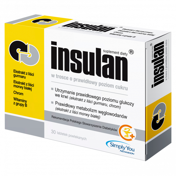 Insulan - ekstrakt z liści gurmaru oraz z liści morwy białej zawiera substancje hamujące działanie enzymów odpowiedzialnych za rozkład węglowodanów w organizmie, co wpływa na ograniczenie wchłaniania glukozy i uzyskanie niższego poziomu cukru we krwi. Kwas gymnemowy pomaga utrzymać prawidłowy poziom cukru w organizmie. Chrom wspomaga przemianę węglowodanów, a witamina E przyczynia się do ochrony składników komórki przed stresem oksydacyjnym powodującym m.in. procesy zapalne. Opakowanie zawiera 30 sztuk.