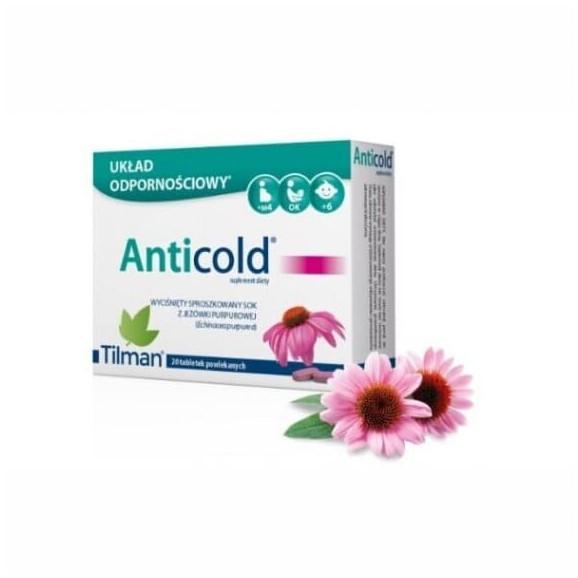 Anticold to suplement diety zawierający standaryzowany wyciśnięty, sproszkowany sok z ziela jeżówki purpurowej ( Echinacea purpurea) wyprodukowany wedłud standardów farmaceutycznych.