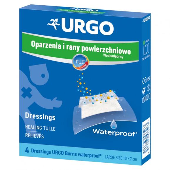 URGO Oparzenia i rany powierzchniowe, opatrunki wodoodporne to wyrób medyczny składający się z samoprzylepnego podłoża, wkładu chłonnego i siateczki lipidowo-koloidowej. Opatentowana formuła umożliwia szybkie uśmierzenie bólu oraz przyspiesza gojenie poprzez wytworzenie żelu lipidowo-koloidowego w kontakcie z wysiękiem, co tworzy optymalne warunki do gojenia rany w wilgotnym środowisku. Produkt zapewnia bezbolesne usuwanie dzięki temu, że nie przywiera do rany. Wskazania do stosowania obejmują leczenie powierzchownych oparzeń I i II stopnia oraz powierzchniowych ran.
