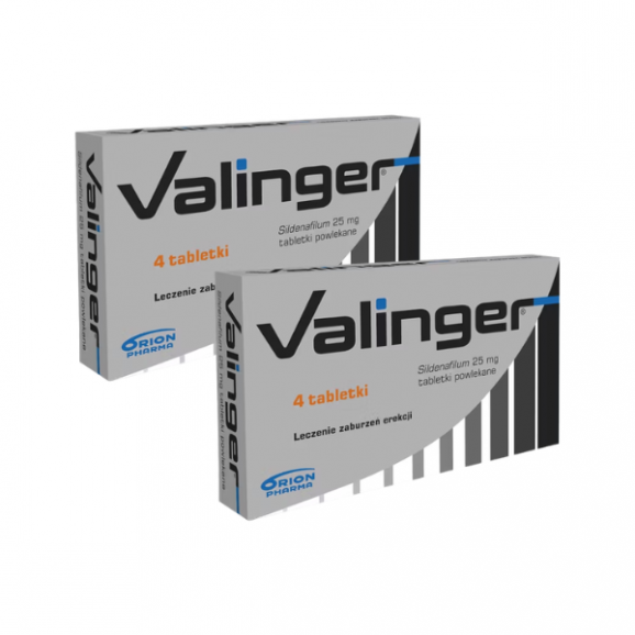 Valinger 25 mg to lek bez recepty przeznaczony do stosowania doustnego u dorosłych mężczyzn w leczeniu zaburzeń wzwodu (erekcji). Substancją czynną jest syldenafil (inhibitor PDE5), który – w warunkach pobudzenia seksualnego – wspomaga rozkurcz naczyń krwionośnych w prąciu, zwiększając napływ krwi i ułatwiając osiągnięcie oraz utrzymanie wzwodu.