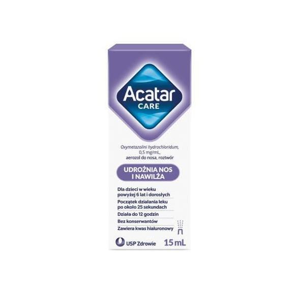 Lek Acatar Care aerozol do nosa zawiera jako substancję czynną oksymetazoliny chlorowodorek, który zwęża naczynia krwionośne. Podanie leku Acatar Care zmniejsza obrzęk zmienionej zapalnie błony śluzowej i hamuje nadmierne wydzielanie, co ułatwia swobodne oddychanie przez nos. Zmniejszenie przekrwienia błony śluzowej nosa powoduje również otwarcie i rozszerzenie przewodów odprowadzających zatok przynosowych i odblokowuje trąbki słuchowe. Ułatwia to usuwanie wydzieliny i wyleczenie zakażenia bakteryjnego.