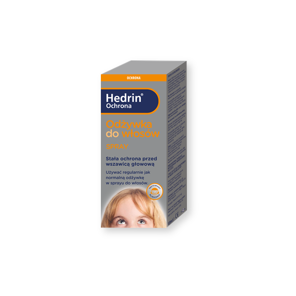 Hedrin Ochrona, odżywka w sprayu do włosów - preparat do zapobiegania zarażaniu się wszawicą w formie odżywki do włosów w sprayu, zawierający Actividol® + 4% Dimetikon®. Aktywne składniki preparatu o potwierdzonym klinicznie działaniu ochronnym, skutecznie zabezpieczają przed rozwojem wszawicy. Działanie preparatu polega na przerwaniu cyklu życiowego wszy głowowych i zapobieganiu ich dalszemu rozwojowi i rozprzestrzenianiu się. Łagodna formuła umożliwiająca łatwe rozczesywanie, chroniąca i wzmacniająca włosy, do nakładania na suche lub mokre włosy. Przyjemny owocowy zapach pomarańczy i mango, bezpieczny do stosowania u dzieci już od 6 miesiąca życia. Pojemność 120 ml.