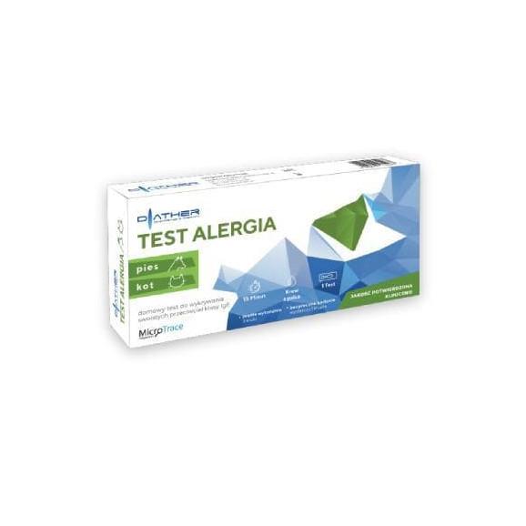 Diather Test Alergia Pies Kot domowy test do wykrywania swoistych przeciwciał klasy IgE swoistych wobec alergenów sierści psa i kota. TEST ALERGIA pies kot jest przeznaczony dla osób z podejrzeniem alergii (świąt luz zaczerwienienie skóry, powtarzające się łzawienie oczu i kichanie), zwłaszcza jeśli atopia dotyka najbliżej rodziny.