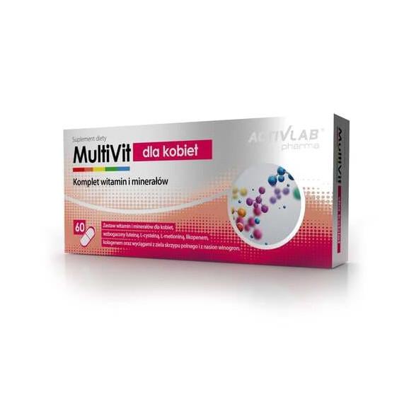 MultiVit dla kobiet Activlab Pharma to suplement diety zawierający pełen zestaw witamin i minerałów opracowany specjalnie dla kobiet. Produkt został dodatkowo wzbogacony luteiną, L-cysteiną, L-metioniną, likopenem, kolagenem oraz wyciągami z ziela skrzypu polnego i z nasion winogron.