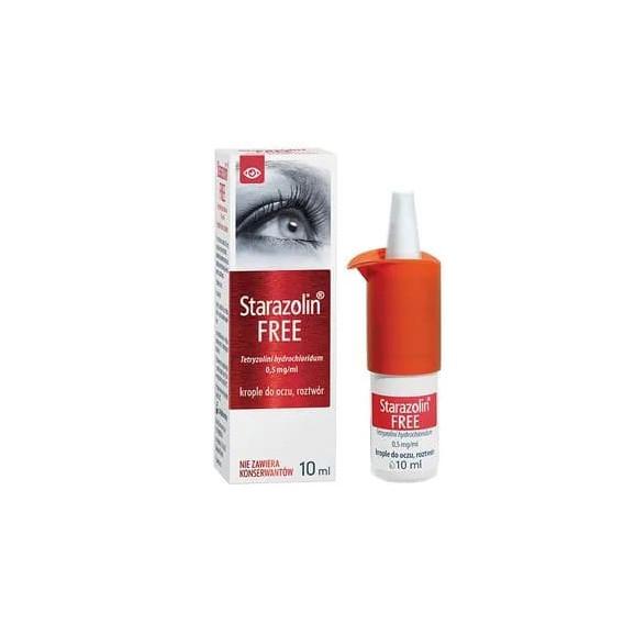Lek Starazolin Free to roztwór kropli do oczu, którego substancją czynną jest tetryzoliny chlorowodorek, który należy do grupy leków zwężających naczynia krwionośne oka. Lek przeznaczony jest do stosowania podczas podrażnienia oraz zaczerwienienia oka, powstałego przez dym, wiatr, chlorowaną wodę lub światło oraz w przypadku alergicznego zapalenia oka.