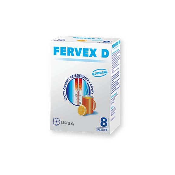 Fervex D to lek do doraźnego leczenia objawowym przeziębienia i grypy. Fervex D ma postać granulatu do sporządzania roztworu doustnego, zawierającego 3 składniki aktywne. Pierwszy z nich to przeciwbólowy i przeciwgorączkowy paracetamol. Natomiast drugi, czyli feniramina powoduje zmniejszenie obrzęku i przekrwienia błony śluzowej nosa, dzięki czemu udrażnia nos. Trzeci składnik to witamina C, uzupełniająca jej niedobory. Fervex D można stosować u osób chorych na cukrzycę.