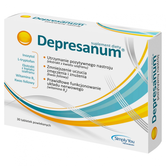 Suplement diety Depresanum w postaci tabletek powlekanych zawiera starannie dobrane składniki, które wspomagają prawidłowe funkcjonowanie układu nerwowego i utrzymanie dobrego samopoczucia. Każda tabletka powlekana zawiera: 100 mg inozytolu, 100 mg L-tryptofanu, 15 mg ekstraktu z kwiatu szafranu, 210 μg witaminy B6 i 100 μg kwasu foliowego. Preparat jest odpowiedni dla osób dorosłych.