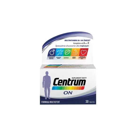 Centrum® On to suplement diety, którego formuła została opracowana w odpowiedzi na potrzeby odżywcze dorosłych mężczyzn. Każda tabletka to połączenie 13 witamin, w tym witamin z grupy B, witamin rozpuszczalnych w tłuszczach: A, D, E, K; witaminy C oraz 10 cennych składników mineralnych, wśród których jest: selen, miedź, cynk i chrom.
