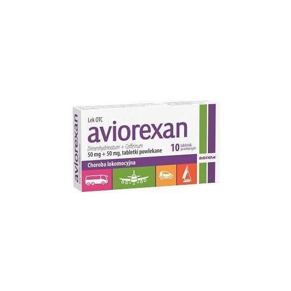 Aviorexan jest lekiem złożonym, zawierającym dwie substancje czynne: dimenhydraminę i kofeinę. Dimenhydramina należy do grupy leków przeciwhistaminowych. Kofeina działa pobudzająco na układ nerwowy. Obie substancje wpływają na zmniejszenie objawów w przebiegu choroby lokomocyjnej. Kofeina łagodzi działanie uspokajające dimenhydraminy.