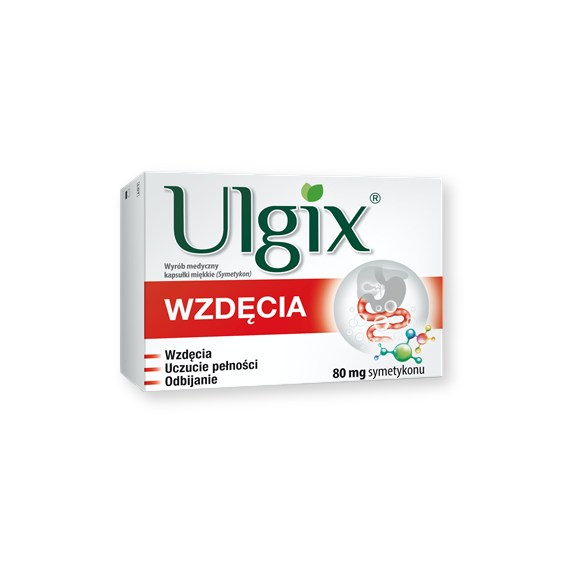 Wyrób medyczny Ulgix Wzdęcia zawiera symetykon, który jest stabilną mieszaniną polimeru silikonu i dwutlenku krzemu o właściwościach odpieniających i adsorbujących gazy jelitowe.