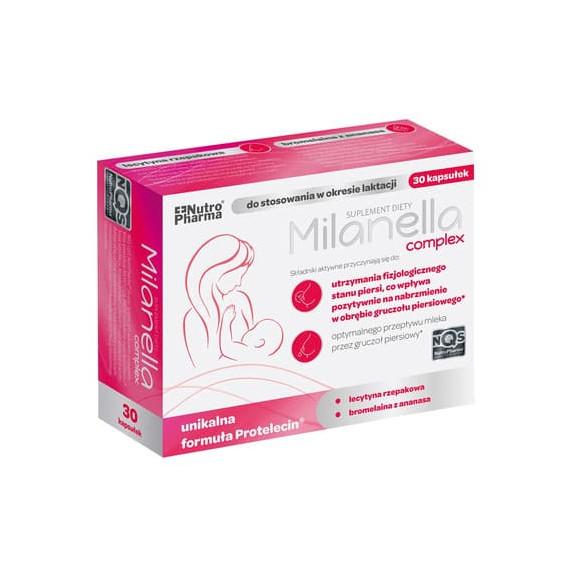Milanella Complex NutroPharma® to innowacyjny suplement diety opracowany w celu uzupełnienia codziennej diety kobiet w okresie laktacji. Każda kapsułka zawiera unikalną formułę Protelecin® łączącą lecytynę rzepakową i bromelainę z ananasa. Odolejona lecytyna odznacza się większą zawartością prozdrowotnych fosfolipidów, w porównaniu do lecytyny płynnej, co umożliwia wyższe spożycie fosfolipidów w mniejszej porcji lecytyny.