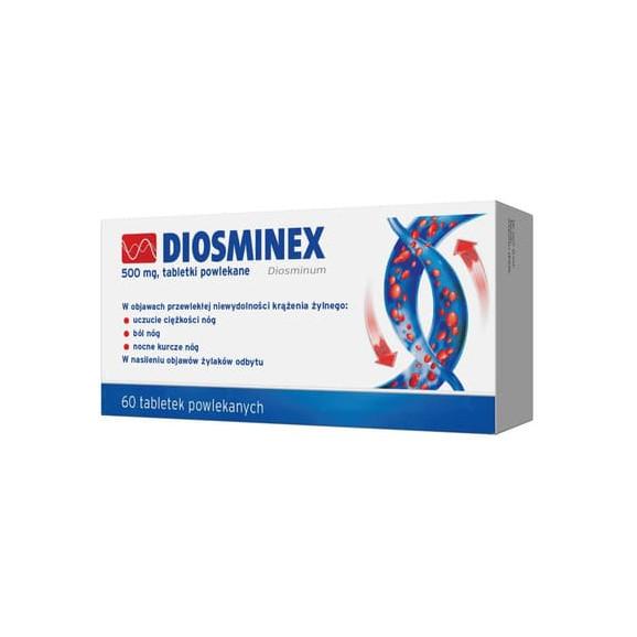 Diosminex to lek w formie tabletek powlekanych, który stosuje się podczas leczenia objawów towarzyszących niewydolności krążenia żylnego u dorosłych, jak: bóle nóg, nocne kurcze czy uczucie ciężkości nóg. Produkt leczniczy zawiera zmikronizowaną diosminę, zwiększającą napięcie naczyń żylnych a także działa ochronnie na naczynia.