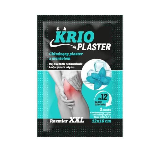 KRIO PLASTER, chłodzący plaster z mentolem, jest wyrobem medycznym przeznaczonym do stosowania na powierzchnię skóry zawierającym mentol, dzięki czemu zmniejsza obrzęki pourazowe oraz działa kojąco w bólach stawowo-mięśniowych m.in. barków, pleców i karku.