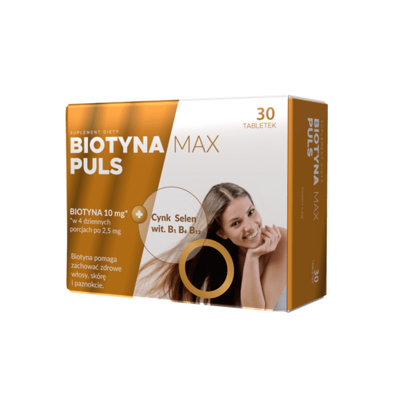 Biotyna MAX PULS jest to suplement diety zawierający odpowiednio dobrane składniki wspomagające wzrost włosów. Biotyna zawarta w produkcie pomaga zachować zdrowie włosów, paznokci, skóry i błon śluzowych. Skład produktu został dodatkowo wzbogacony o potrzebne mikroelementy cynk, selen oraz witaminy B1, B6, B12. Biotyna wspomaga wzrost włosów oraz formowanie mieszków włosowych.