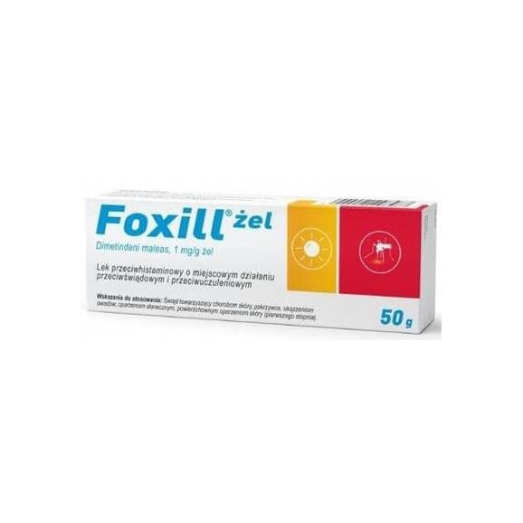 Foxill ma postać żelu do stosowania na skórę. Foxill zawiera substancję czynną dimetyndenu maleinian, który hamuje działanie histaminy - substancji odpowiedzialnej za reakcje alergiczne. Lek działa miejscowo przeciwuczuleniowo, silnie przeciwświądowo (z wyłączeniem świądu cholestatycznego), zmniejsza obrzęki, łagodzi podrażnienia skóry. Wykazuje miejscowe właściwości znieczulające. Chłodzi, co dodatkowo łagodzi podrażnioną skórę.
