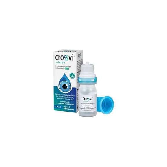 CROSSVI INTENSE to sterylny roztwór o fizjologicznym pH do stosowania okulistycznego, oparty na opatentowanej technologii sieciowania kwasu hialuronowego (HA) za pomocą mocznika, która poprawia i wzmacnia specyficzne właściwości mechaniczne liniowego HA. Usieciowany HA jest znacznie dłużej odporny na działanie hialuronidazy niż liniowy HA, a zatem wykazuje zwiększone i dłuższe działanie lubrykacyjne i nawilżające w porównaniu do liniowego HA.Skład Usieciowany wodny roztwór hialuronianu sodu (w tym 0,4\% usieciowanego hialuronianu sodu), trometamol, kwas chlorowodorowy 2N, chlorek sodu, woda do iniekcji. Bez konserwantów.StosowanieDokładnie umyj ręce.Przed pierwszym użyciem usuń uszczelkę zabezpieczającą.Zdejmij nasadkę zabezpieczającą i otwórz butelkę.Odwróć butelkę do góry dnem i delikatnie wyciśnij po 2 krople do każdego oka, chyba że zalecono inaczej.Zawartość opakowania należy zużyć w ciągu 3 miesięcy po pierwszym otwarciu.DziałanieŁagodzi suchość, podrażnienie i uczucie dyskomfortu oczu, w tym błony śluzowej oka.Wskazania - w celu przywrócenia i poprawy stabilności filmu łzowego w przypadku zespołu suchego oka- po chirurgii refrakcyjnej oka- w celu łagodzenia zaczerwienienia, zmęczenia i uczucia dyskomfortu oczu lub błony śluzowej oka z powodu: czynników środowiskowych (klimatyzacja, nadmierna ekspozycja na promieniowanie słoneczne, wiatr, dym, zanieczyszczenia, woda morska lub basenowa, morskie powietrze), suchości oczu spowodowanej nadmiernym zmęczeniem związanym z długotrwałą pracą przy komputerze, nauką, nieprawidłowości w łzawieniu po przebytych stanach zapalnych, przewlekłym zapaleniu powiek, nieprawidłowości w łzawieniu po operacjach okulistycznych o różnym podłożu lub chirurgii estetycznej powiek, noszenia miękkich lub półtwardych soczewek kontaktowych- polecane do codziennego użytku, w dzień lub w nocy.Przeciwwskazania Nie stosować w przypadku nadwrażliwości na którykolwiek ze składników.Uwagi Preparat należy przechowywać w sposób niedostępny dla małych dzieci.