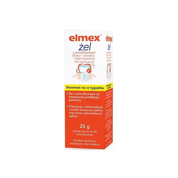 Elmex żel 12,5 mg z aminofluorkami to produkt farmaceutyczny stosowany profilaktycznie w celu intensywnej profilaktyki próchnicy, zwłaszcza u dzieci, młodzieży oraz osób z aparatami ortodontycznymi, mostami lub częściowymi protezami, które są szczególnie narażone na próchnicę. Leczniczo w celu remineralizacji wczesnych zmian próchnicowych, a także do leczenia nadwrażliwości szyjek zębowych.