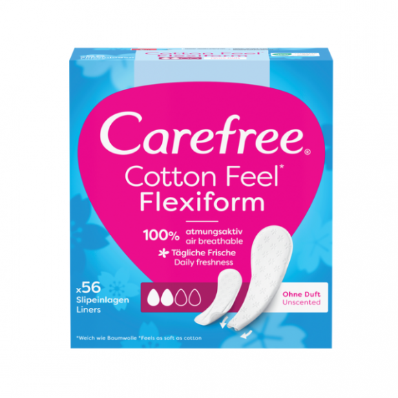 Carefree Cotton Feel Flexiform to uniwersalne wkładki higieniczne, które idealnie dopasowują się do każdego rodzaju bielizny: klasycznej oraz typu string. Specjalnie opracowana, testowana dermatologicznie powłoczka Soft Touch jest wyjątkowo miękka w dotyku i przypomina bawełnę, dzięki czemu jest bardzo delikatna dla skóry. Oddychająca wkładka zapewnia wysoką chłonność, a 4 przewiewne warstwy swobodny przepływ powietrza. Wkładki są nieperfumowane, nie zawierają barwników i nie są bielone chlorem. Doskonale przylegają do bielizny i dopasowują się do ruchów ciała. Dzięki miękkim, podwijanym bokom zapewniają jeszcze większy komfort noszenia.