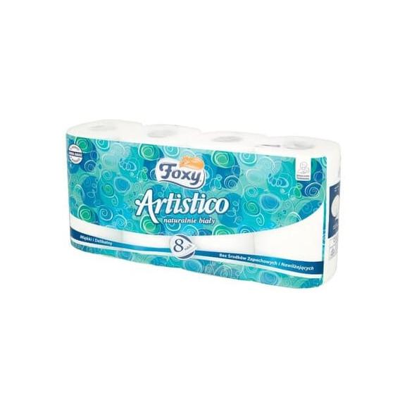 Papier toaletowy 2 warstwy. Specjalna technologia zastosowana w Foxy Artistico uwypukla objętość papieru i powoduje, że produkt jest niezwykle gruby. Wystarczy poczuć go między palcami, aby docenić różnicę w porównaniu z innymi produktami. Z wzorem "miękkie poduszeczki" miękkość łączy się z wytrzymałością. Unikalne wytłoczenie zwiększa znacznie wytrzymałość i powoduje przyjemne odczucie miękkości na powierzchni papieru. Został wyprodukowany z włókien czystej 100% celulozy. Wersja "Naturalnie biały" jest bezzapachowa i pozbawiona dodatkowych barwników. Wyjątkowo chłonny. Łatwo rozpuszczalny w wodzie. Opakowanie nadające się do recyklingu.