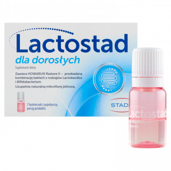 Lactostad dla dorosłych to suplement diety zawierający żywe kultury bakterii z rodzaju Lactobacillus i Bifidobactrium. Każda pojedyncza porcja produktu to co najmniej 50 miliardów jednostek tworzących kolonię dla uzupełnienia codziennej diety.