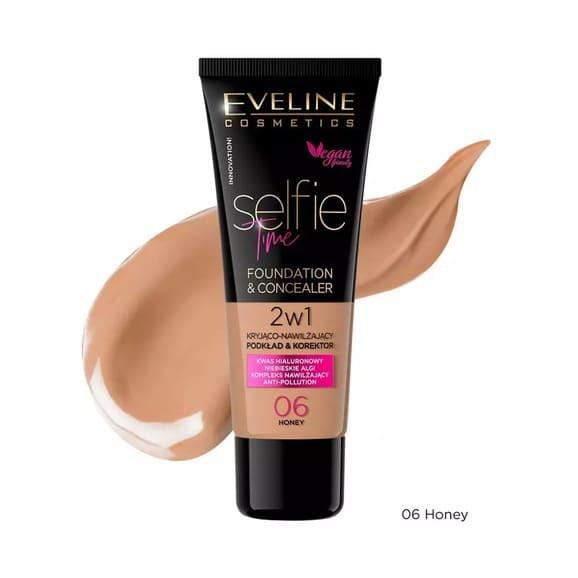 Podkład i korektor 2w1 kryjąco-nawilżający Eveline Selfie Time, 06 HONEY, 30 ml