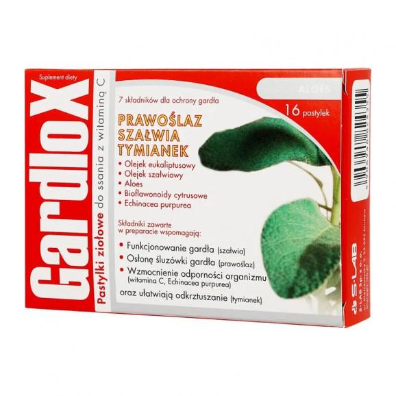 Gardlox to suplement diety w postaci ziołowych pastylek do ssania z witaminą C i aloesem. Zawiera składniki tradycyjnie stosowane w dolegliwościach gardła oraz w okresach zwiększonego ryzyka infekcji.