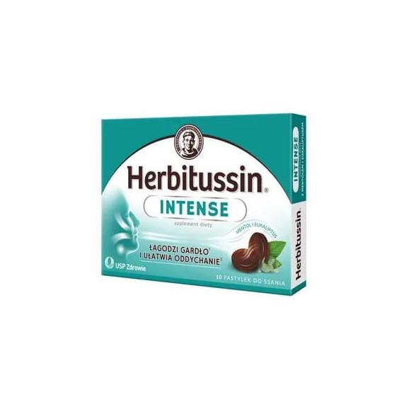 Herbitussin INTENSE to suplement diety w postaci pastylek do ssania zawierający mentol, olejek eukaliptusowy i witaminę C. Olejek eukaliptusowy działa łagodząco na gardło, krtań i struny głosowe, mentol pomaga ułatwiać oddychanie, a witamina C wspomaga prawidłowe funkcjonowanie układu odpornościowego.