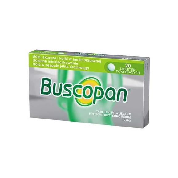 Buscopan jest lekiem rozkurczowym, którego działanie polega na zmniejszeniu skurczy mięśni gładkich narządów wewnętrznych jamy brzusznej, w tym przewodu pokarmowego, dróg żółciowych, układu moczowego oraz dróg rodnych kobiet. Lek stosuje się w celu łagodzenia nasilających się i/lub słabnących bólów kolkowych pojawiających się w obrębie jamy brzusznej, których dokładna lokalizacja jest trudna do określenia. Lek stosuje się w przypadku: