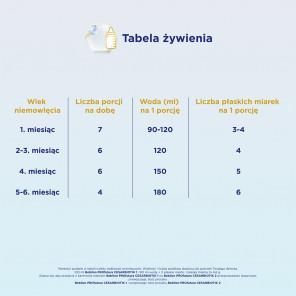 matki przez pierwsze sześć miesięcy życia. Produkt jest odpowiedni jako uzupełnienie karmienia piersią, jeśli zaistnieje konieczność dokarmiania. Produkt powinien stanowić tylko część zróżnicowanej diety niemowlęcia. Decyzję dotyczącą rozpoczęcia wprowadzania pokarmów uzupełniających, zwłaszcza poniżej szóstego miesiąca życia, należy podjąć po konsultacji z lekarzem, uwzględniając indywidualne zapotrzebowanie niemowlęcia. Dla zdrowia dziecka ważna jest urozmaicona i zbilansowana dieta oraz zdrowy tryb życia. Ważne jest, aby po skończonym posiłku dziecko nie przetrzymywało w buzi smoczka z resztkami pokarmu. Należy zwrócić uwagę na prawidłową higienę pierwszych ząbków, szczególnie przed snem.