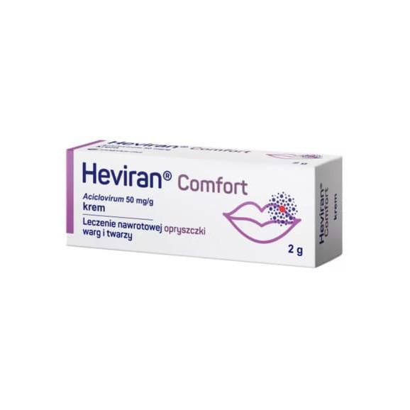 Heviran Comfort to produkt leczniczy w postaci kremu. Produkt wskazany w leczeniu nawrotowej opryszczki warg (tzw. zimno) i twarzy, wywołanej przez wirusa opryszczki pospolitej. Lek Heviran Comfort w postaci kremu do stosowania na skórę zawiera substancję czynną acyklowir o działaniu przeciwwirusowym, wykazującą silne działanie na wirusa opryszczki pospolitej (Herpes simplex).