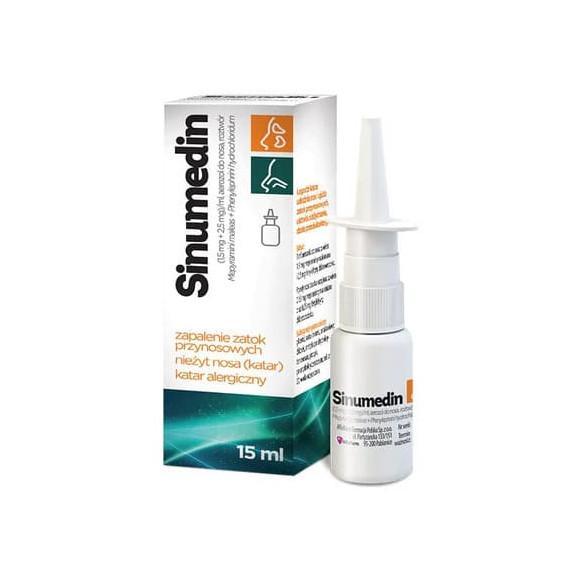 Sinumedin to lek, który jest stosowany w nieżytach nosa i zatok, a także przy alergii. Substancje czynne zawarte w preparacie działają przeciwhistaminowo i przeciwalergicznie (mepiramina) oraz zmniejszają przekrwienie błony śluzowej i udrażniają nos, jak również ujścia zatok przynosowych (fenylefryna), dzięki czemu ułatwia oddychanie. Dodatkowo substancja pomocnicza- chlorek cetalkoniowy ma właściwości przeciwbakteryjne. Jest przeznaczony dla osób dorosłych i dzieci powyżej 6. roku życia. Niewielkie, wygodne do przenoszenia opakowanie pozwala na stosowanie roztworu w dowolnym czasie i w dowolnym miejscu.