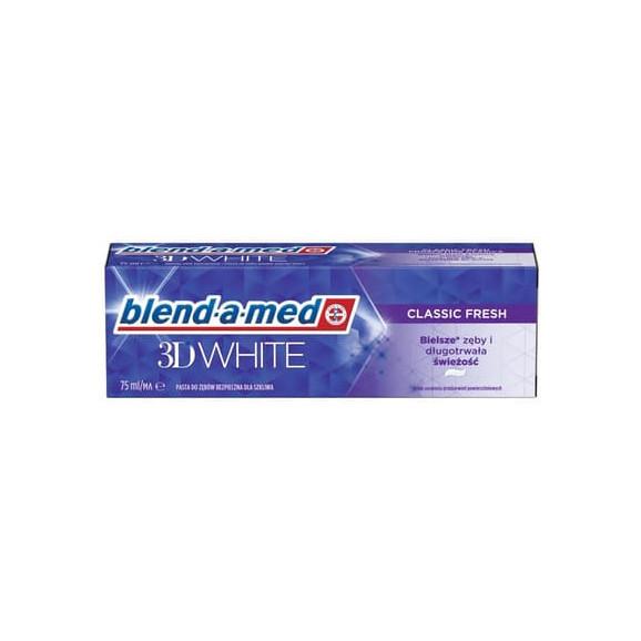 Blend-a-med 3D White to pasta do zębów zawierająca fluorek sodu, która bardzo dobrze oczyszcza jamę ustną z przebarwień oraz resztek pokarmu. Pasta wybiela zęby i zapewnia długotrwałe uczucie świeżości. Pasta zawiera cząsteczki, które podczas stosowania pokrywają zęby i nadają im trójwymiarowego wybielenia. Umożliwia to w łagodny sposób oczyścić powierzchnię zębów z nieestetycznych przebarwień oraz resztek pokarmu, zapewniając biały uśmiech. Formuła Classic Fresh nadaje długotrwałego uczucia świeżości.