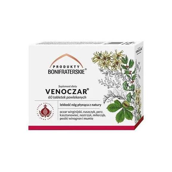 Suplement diety Venoczar to produkt powstały w oparciu o wieloletnie doświadczenie oraz tradycję zakonu Bonifratów związaną z najwyższej jakości ziołowymi składnikami i produktami. Preparat zawiera w swoim składzie między innymi ekstrakty z ruszczyka, nostrzyka, kasztanowca, winogron, miłorzębu czy oczaru wirginijskiego. Preparat przeznaczony jest do suplementacji diety osób dorosłych o zwiększonym zapotrzebowaniu na składniki pozwalające utrzymać w zdrowiu naczynia krwionośne oraz wspierające prawidłowe funkcjonowanie naczyń żylnych.