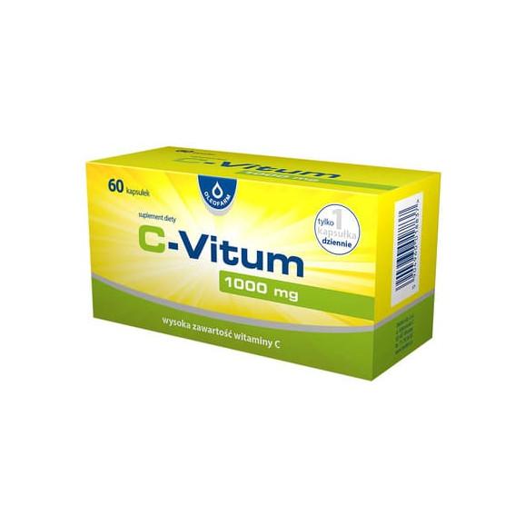 Oleofarm C-Vitum 1000 mg to przeznaczony dla dorosłych suplement diety w postaci kapsułek. Zawiera witaminę C w formie kwasu L-askorbinowego. W jednej kapsułce (zalecanym dziennym spożyciu) mieści się 1000 mg witaminy C, co odpowiada 1250% Referencyjnej Wartości Spożycia tego składnika dla przeciętnej osoby dorosłej.