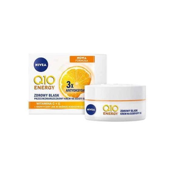 Przeciwzmarszczkowy krem energetyzujący na dzień Nivea Q10 Plus wyraźnie redukuje widoczność zmarszczek oraz natychmiastowo pobudza skórę, aby wygladała świeżo i promiennie. Pobudza skórę i zmniejsza oznaki zmęczenia. Skutecznie zwalcza zmarszczki od wewnątrz. Zwiększa naturalny poziom koenzymu Q10 i kreatyny w skórze. Dzięki filtrowi SPF 15 i ochronie UVA zapobiega powstawaniu zmarszczek pod wpływem promieniowania słonecznego.