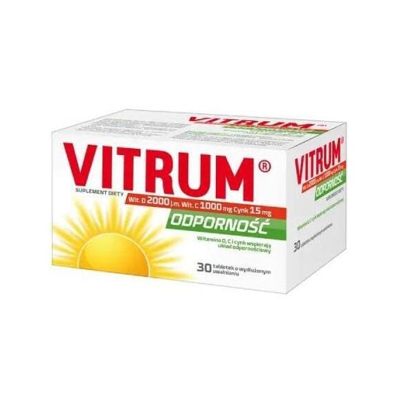 Vitrum Odporność to produkt o wysokiej zawartości niezbędnych składników (witaminy D, witaminy C i cynku) wspierających układ odpornościowy, zamkniętych w nowoczesnej tabletce o wydłużonym uwalnianiu, by zapewnić ich najlepsze wchłanianie.