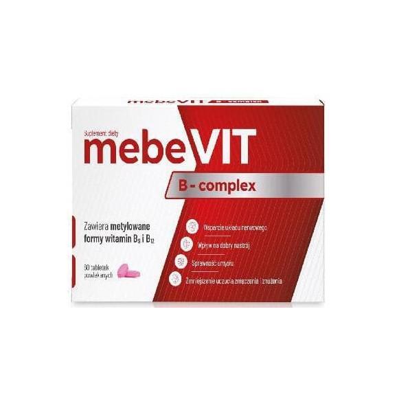 Witaminy z grupy B są niezbędne do prawidłowego funkcjonowania naszego organizmu. Wspomagają funkcjonowanie układu nerwowego, a co za tym idzie stan zdrowia psychicznego, pozytywnie wpływają na nastrój, utrzymują sprawność intelektualną, a także biorą udział w procesach metabolicznych, między innymi w metabolizmie homocysteiny. Dodatkowo wpływają na zmniejszenie uczucia zmęczenia i znużenia. MebeVIT B-complex zawiera kompleks witamin z grupy B o udowodnionym działaniu, w tym metylowane formy witaminy B9 czyli kwasu foliowego (Quatrefolic®) oraz witaminy B12 (metylokobalamina). Każda tabletka zawiera wysoką porcję tiaminy, kwasu foliowego, witaminy B6 i B12, niacynę oraz pantotenian wapnia. Foliany, tiamina, witamina B6 stanowią cenne wsparcie dla prawidłowego funkcjonowania układu nerwowego. Jednocześnie składniki te przyczyniają się do utrzymania prawidłowych funkcji psychologicznych , co przyczynia się do pozytywnego wpływu na dobry nastrój. Dodatkowo witamina B2, B6, B12, niacyna, kwas pantotenowy, kwas foliowy zmniejszają uczucie zmęczenia i znużenia organizmu. Kwas pantotenowy pomaga w utrzymaniu sprawności umysłowej na prawidłowym poziomie. Witaminy B9 (kwas foliowy) i B12 wraz z pożywieniem dostarczane są w formie nieaktywnej. Aby zostały prawidłowo wykorzystane muszą ulec przemianom w organizmie. Istotną rolę w przekształceniu tych witamin do postaci aktywnych odgrywa proces metylacji. Tak więc formy metylowane witamin B9 i B12 są łatwiej dostępne niż ich nieaktywne odpowiedniki.