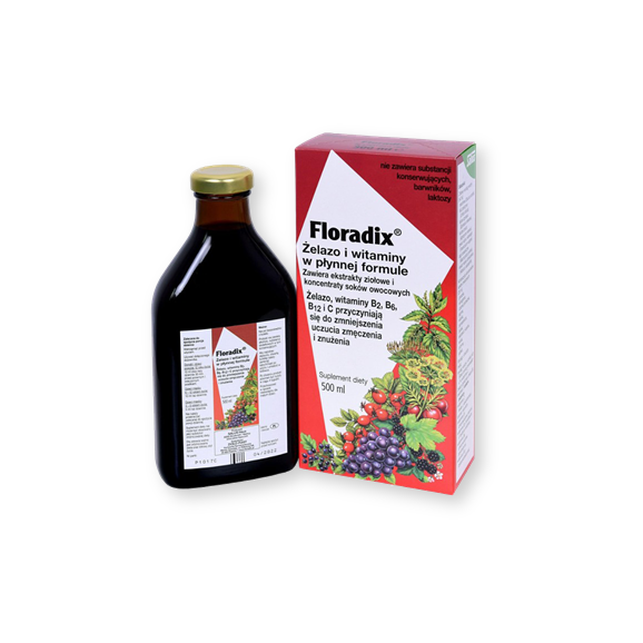 FLORADIX Żelazo i witaminy - suplement diety zawierający ekstrakty ziołowe i koncentraty soków owocowych. Produkt przeznaczony dla dzieci powyżej 12 roku życia i osób dorosłych.