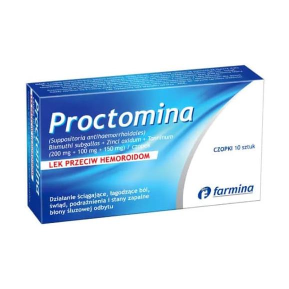 Proctomina to produkt leczniczy w postaci czopków doodbytniczych, stosowany w celu łagodzenia bólu i świadu towarzyszącego chorobie hemoroidalnej. Lek łagodzi stany zapalne oraz podrażnienia błony śluzowej odbytu.