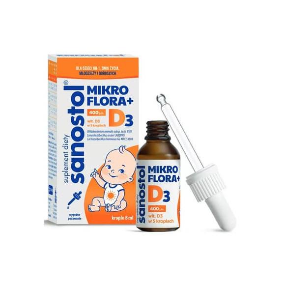 Sanostol Mikroflora+D3 to suplement diety w postaci kropli, który zawiera szczepy bakteryjne i witaminę D. Produkt przeznaczony dla niemowląt od 1 dnia życia i dorosłych.