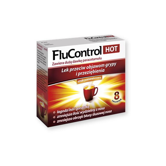 Lek FluControl Hot przeznaczony jest do leczenia objawowego przeziębienia i grypy, przebiegających z gorączką, słabym lub umiarkowanym bólem, obrzękiem błony śluzowej nosa z tworzeniem wydzieliny.