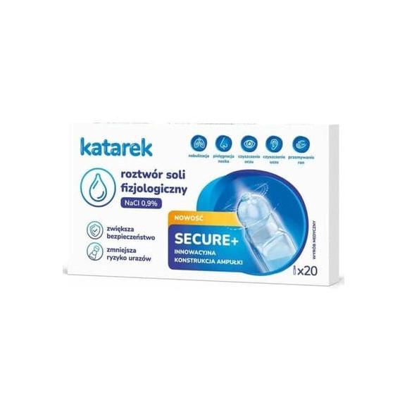 Katarek Secure+ to sól fizjologiczna NaCl 0,9% zamknięta w ampułce o innowacyjnej konstrukcji. Roztwór soli fizjologicznej jest wyrobem medycznym, stosowanym do zakrapiania oczu, nawilżania nosa, oczyszczania ucha, przemywania ran, rozrzedzania wydzieliny z nosa przed aspiracją oraz jest roztworem do nebulizacji i inhalacji. Szerokie zastosowanie soli fizjologicznej, która jest podstawą wielu zabiegów pielęgnacyjnych u niemowląt musiała zostać zamknięta w opakowaniu, które zapewnia bezpieczną i wygodną aplikację. Marka Katarek stworzyła przełomową, innowacyjną konstrukcję ampułki z łagodnie zaokrąglonym kształtem jej główki, który jest znacznie bezpieczniejszy dla niemowląt. Końcówka ampułki wykonana została z delikatniejszego tworzywa zapewniając bezpieczną aplikację do delikatnych błon oka, ucha, nosa. W opakowaniu znajduje się 20 ampułek Katarek Secure+.