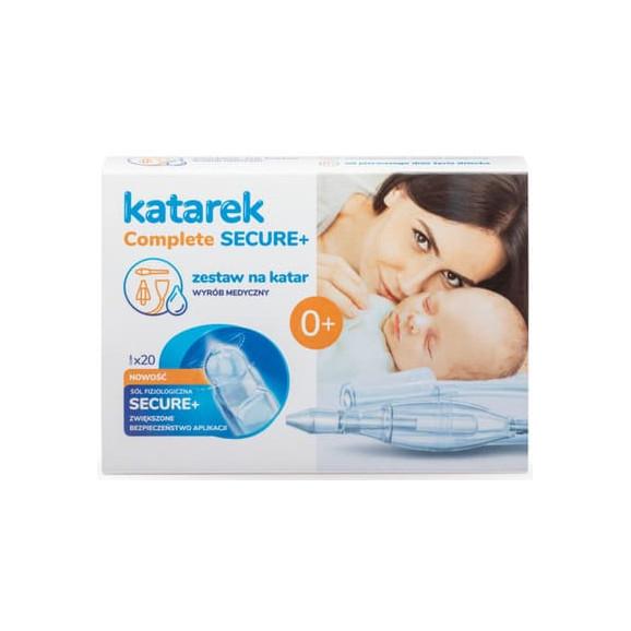 Katarek Complete Secure+ to zestaw na katar, który zawiera aspirator kataru podłączany do domowego odkurzacza, 20 ampułek soli fizjologicznej Katarek Secure+, oraz zestaw akcesoriów a wszystko to zamknięte w wygodnym plastikowym pudełku.